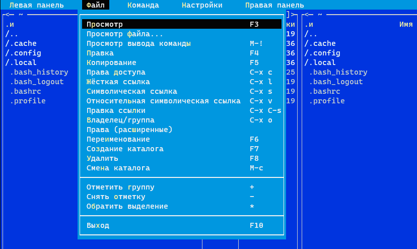 Меню Файл содержит основные действия над файлами, здесь вы можете выполнить базовые действия над файлами, а также быстро изменить права, владельца, создать жесткую или символическую ссылку. Обратите внимание, около команд практически везде стоят сочетания клавиш, рекомендуем их запомнить, что позволит работать гораздо быстрее, не прибегая каждый раз к навигации по меню.