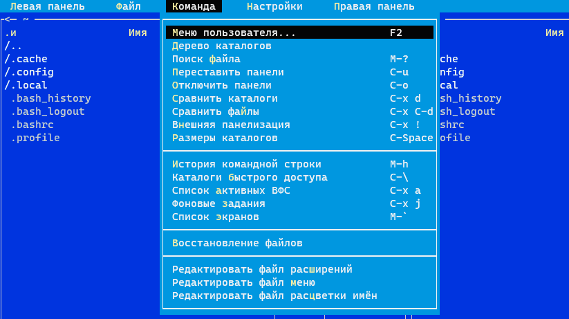 Раздел Команда предоставляет доступ к возможностям самого файлового менеджера, управлению панелями и доступ к некоторым системным функциям: