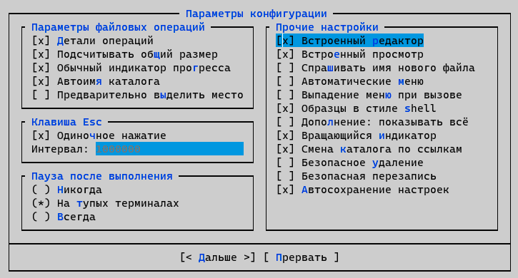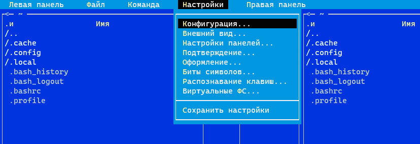 После чего не забудьте сохранить настройки, через одноименный пункт в меню, настройки менеджера индивидуальны для каждого пользователя и хранятся в ~/.config/mc.