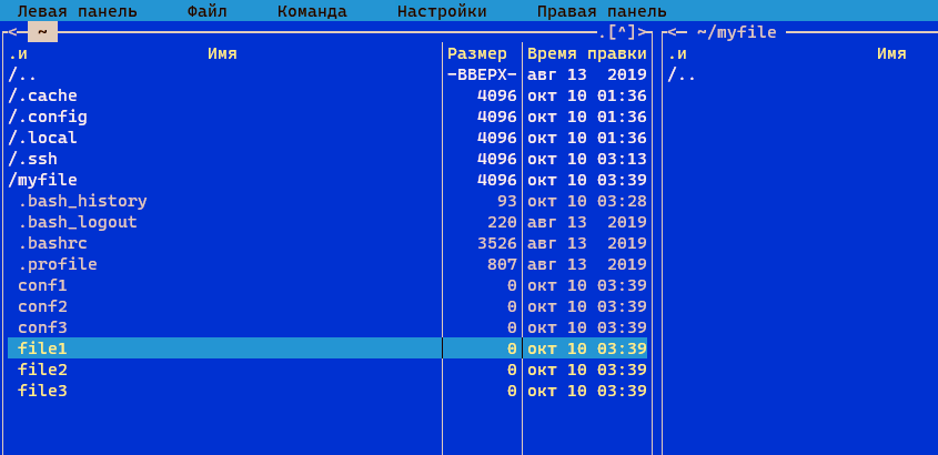 После чего перед вами откроется интерфейс файлового менеджера, состоящий из двух панелей. По умолчанию активна левая панель, она будет показывать содержимое текущей директории, правая панель показывает домашнюю директорию пользователя.