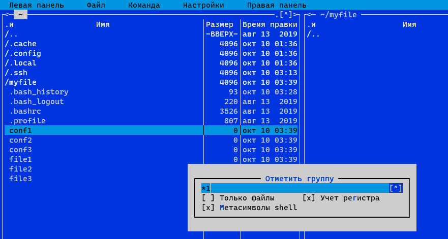 Например, указанная выше маска в нашем случае выделит файлы conf1 и file1. Существует также и обратная возможность - снять выделение по маске с части файлов, для этого используйте клавишу -, принцип действия точно такой же, как и в предыдущем примере. Использование этих возможностей достаточно удобно, скажем, быстро выделить группу файлов по широкой маске, затем снять выделение с некоторых по более узкой. Для того, чтобы инвертировать выделение можно использовать клавишу *, но учтите, что это работает только для файлов.
