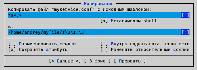 Еще сложнее, допустим мы хотим вместо myservice.conf получить servicemy.conf, в этом случае исходный шаблон будет выглядеть так: *s*.*, мы поделили имя на три части, разделители s и точка. Шаблон приемника укажем как: s\2\1.\3- т.е. выводим сначала первый символ разделитель, потом вторую группу символов, за ней первую, точку и третью группу.