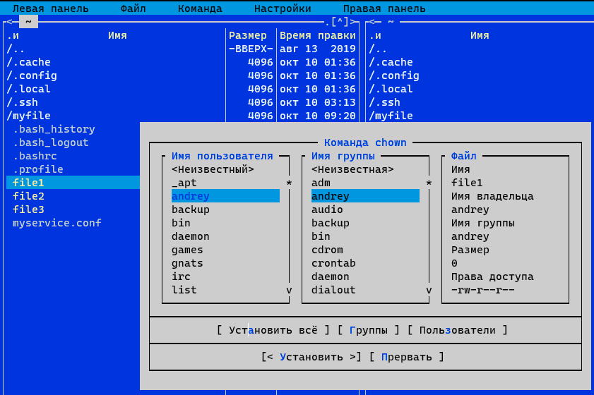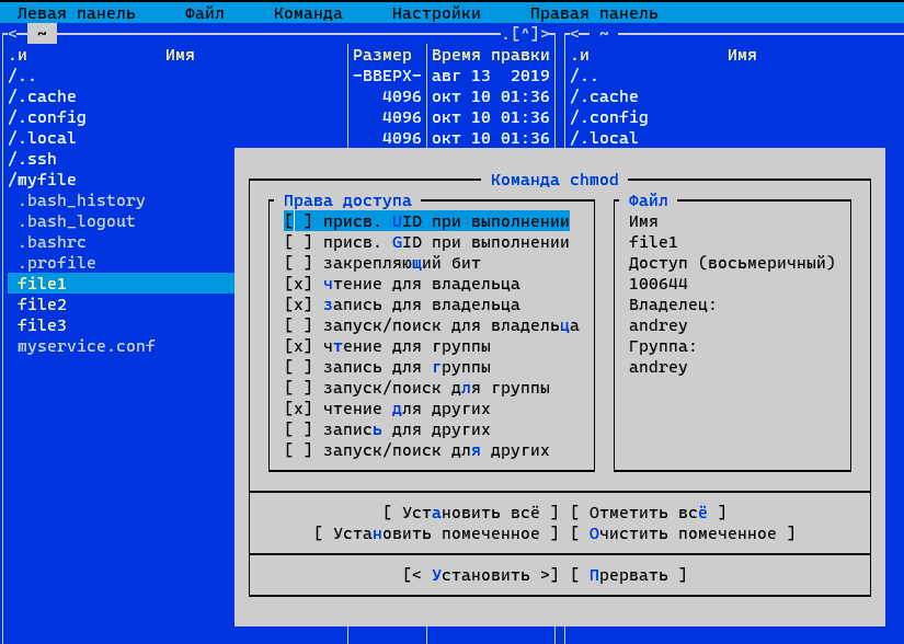 Следующая, часто встречающаяся задача - это изменение прав или владельца объекта. Используйте сочетание клавиш Ctrl + x c (набирается как одновременное нажатие Ctrl и х, затем с) для изменения прав. Можно выделить и изменить права сразу нескольким объектам, но при этом вам будут показаны текущие права только первого выбранного файла.