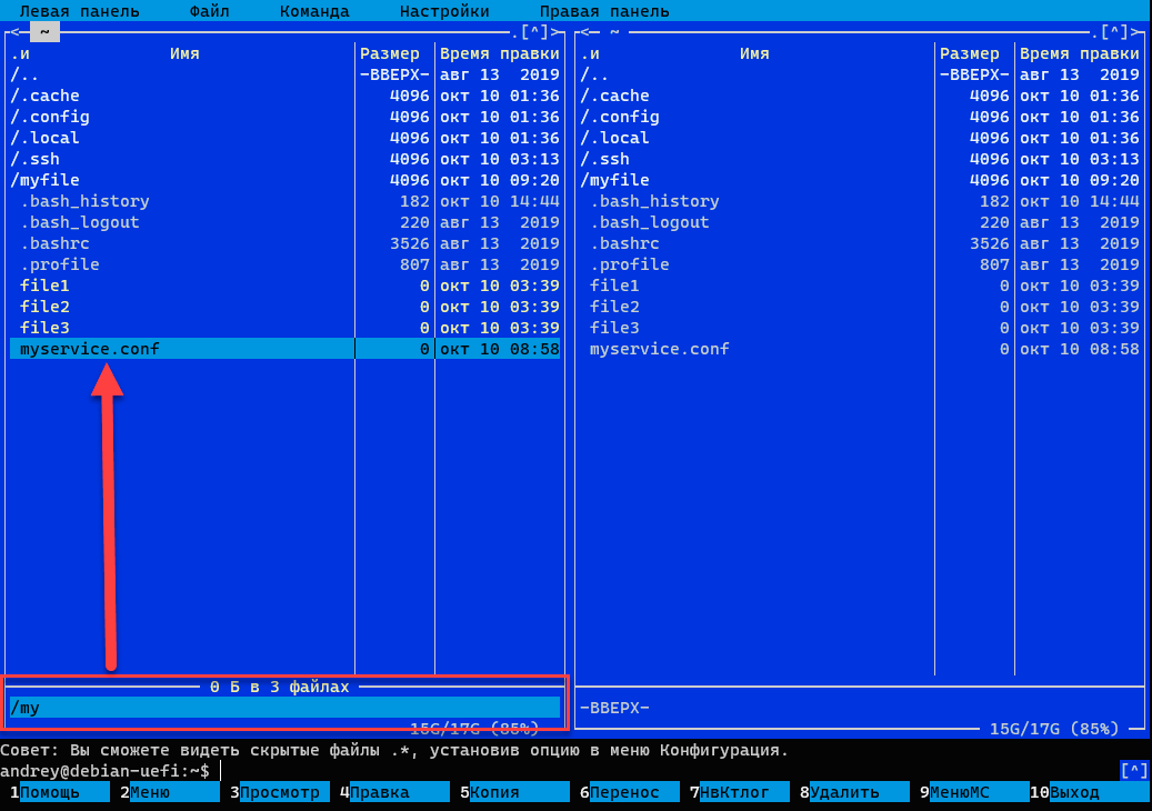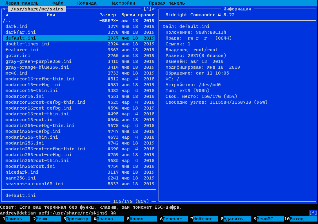 Основы навигации должны быть известны всем, но тем не менее повторимся: для перемещения внутри панелей следует использовать клавиши со стрелками, PageUp и PageDown прокручивают содержимое на размер экрана вверх или вниз, а Home и End перемещают в начало или конец списка, для переключения панелей используется Tab, сочетание клавиш Ctrl + o сворачивает панели и дает доступ к консоли, повторное нажатие этих же клавиш восстанавливает панели.