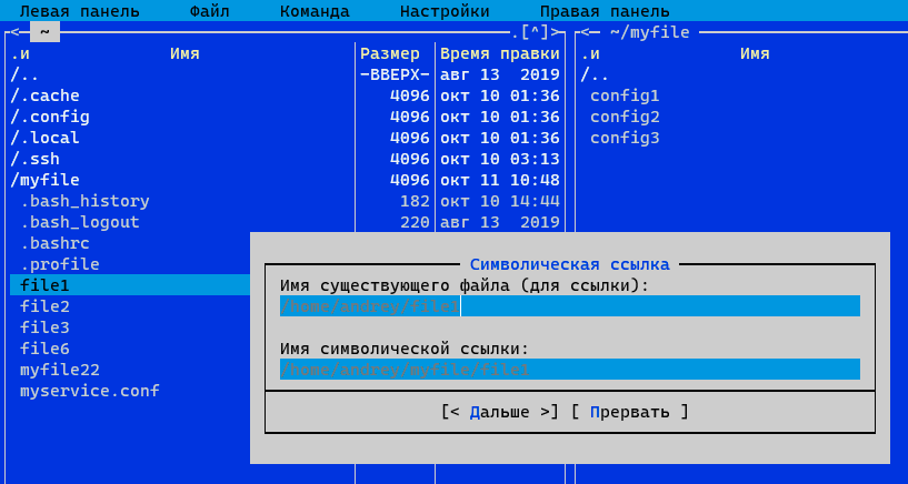 Для быстрого создания жесткой или символической ссылки используйте: Ctrl + x l и Ctrl + x s. Учтите, что по умолчанию жесткая ссылка создается в текущем каталоге, а символическая в каталоге неактивной панели.