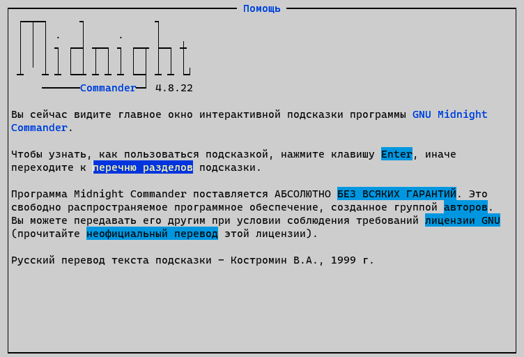 Как видим, Midnight Commander - это достаточно мощный и удобный инструмент, позволяющий значительно упростить работу в консоли, поэтому уметь эффективно работать с ним должен каждый системный администратор. В данной статье мы перечислили далеко не все возможности этого замечательного менеджера, чтобы узнать больше - воспользуйтесь встроенной справкой, она вызывается нажатием клавиши F1.