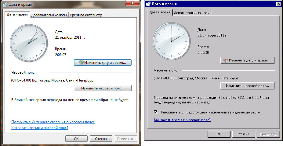 Для учета последних изменений в часовых поясах Microsoft выпустила обновление KB2570791 для всех актуальных ОС, начиная с Windows XP SP3 и Windows Server 2003 SP2. Если у вас включено автоматическое обновление, то скорее всего этот пакет уже установлен, в любом случае не помешает убедиться в этом открыв оснастку Панель управления - Дата и время. Ниже показаны сообщения в данной оснастке для системы с установленным обновлением (слева) и без обновления (справа):