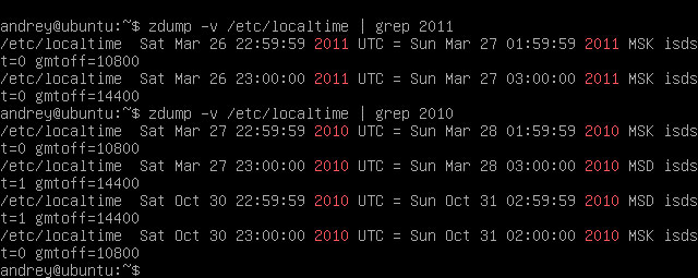 Если пакет обновлен, то вы увидите только две записи, соответствующие переходу на летнее время весной 2011 года, иначе четыре, как в выводе за 2010 год: