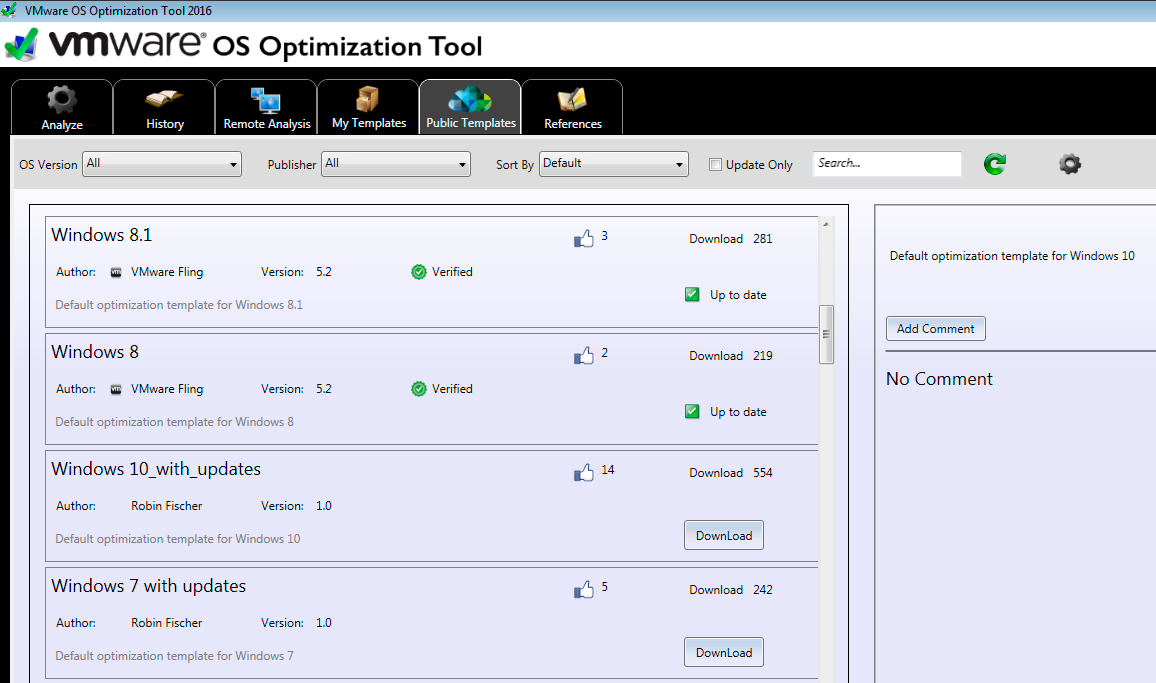 Остается только один вопрос: как это лучше сделать? Настраивать каждую виртуальную систему вручную? К счастью компания VMWare предлагает в свободном доступе достаточно интересный инструмент VMware OS Optimization Tool который можно бесплатно скачать здесь. Несмотря на то, что основным предназначением данной утилиты является оптимизация настольных ОС для работы в среде VMware Horizon View (средства виртуализации настольных ПК), ее можно с успехом применять для любых виртуальных машин, работающих на любом гипервизоре.