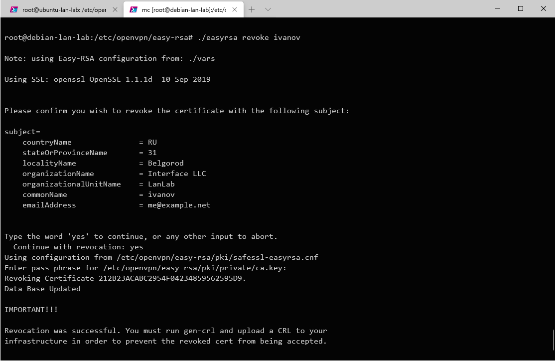 Еще раз напомним, что для отзыва сертификатов мы должны указать их CN, поэтому при их создании задавайте им осмысленные имена, чтобы потом не пришлось угадывать, как называется сертификат Иванова: client123, client231 или client321. Также помните о том, что отзыв сертификата - действие необратимое, даже если вы повторно выпустите сертификат с этим же именем (CN), это будет совсем другой сертификат, который придется заново выдать пользователю.