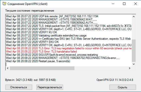 Для клиента с отозванным сертификатом процесс подключения будет "зависать" на этапе согласования ключей и через 60 секунд выдавать в лог сообщение: