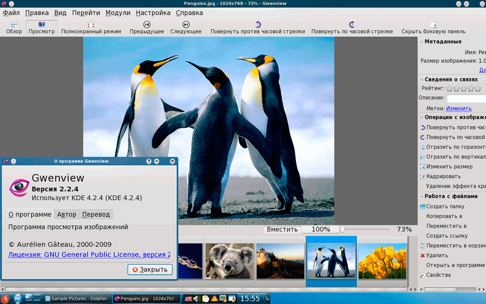 Для просмотра изображений используется Gwenview, имеющий кроме своей основной функции еще и базовые функции обработки изображений.