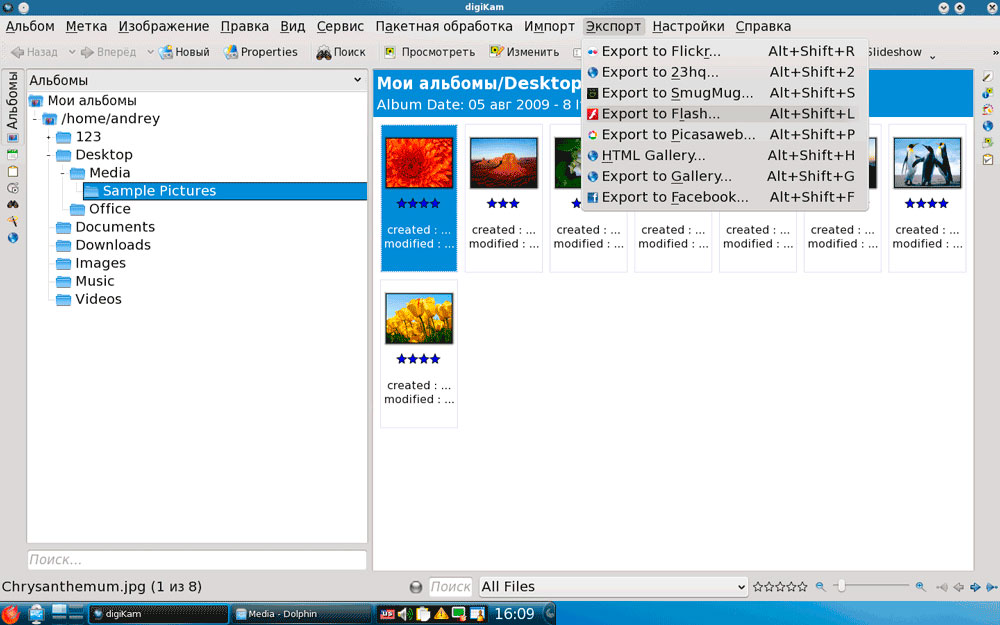 Кроме него в системе имеется еще несколько программ для просмотра и обработки изображений, кроме редактора GIMP, предложен еще и простенький редактор KolourPaint по возможностям соответствующий своему Windows тезке. В качестве менеджера фотографий предложен digiKam имеющий достаточно широкие возможности импорта-экспорта, обработки изображений, создания слайд-шоу, флеш галерей и т.д. и т.п.