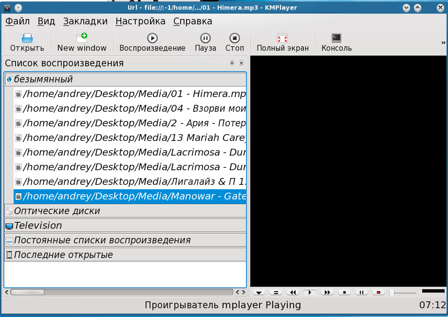 Разобравшись с изображениями мы решили послушать музыку, по умолчанию для этих целей предназначен KMPlayer, который поддерживает все современные аудиоформаты, нарекания возникли только по поводу внешнего вида (скажите, зачем в списке воспроизведения мне нужен полный путь к играемому файлу).