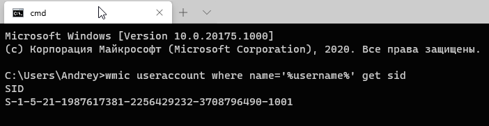 1wmic useraccount where name='%username%' get sid