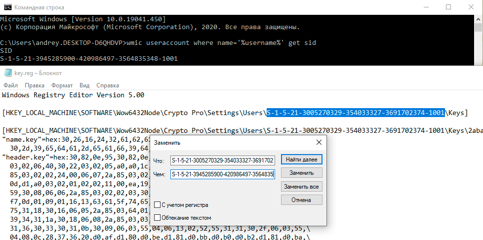 После чего откройте на редактирование файл реестра с экспортированными закрытыми ключами и замените в нем все вхождения старого SID на SID нового пользователя.
