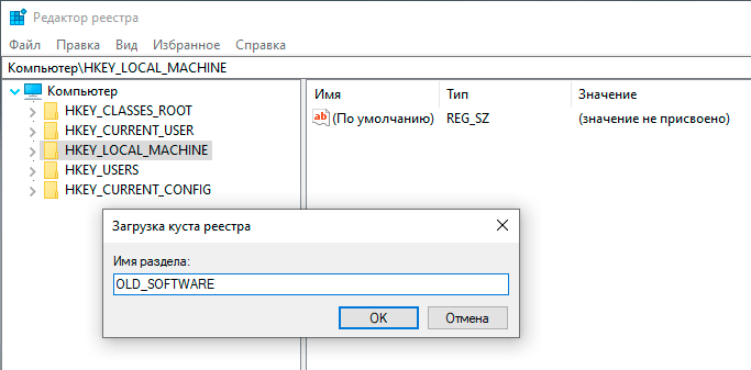 Затем на целевой системе откройте редактор реестра, перейдите в раздел HKEY_LOCAL_MACHINE и через Файл - Загрузить куст подключите скопированный из старой системы раздел реестра. Дайте ему осмысленное имя, скажем OLD_SOFTWARE.