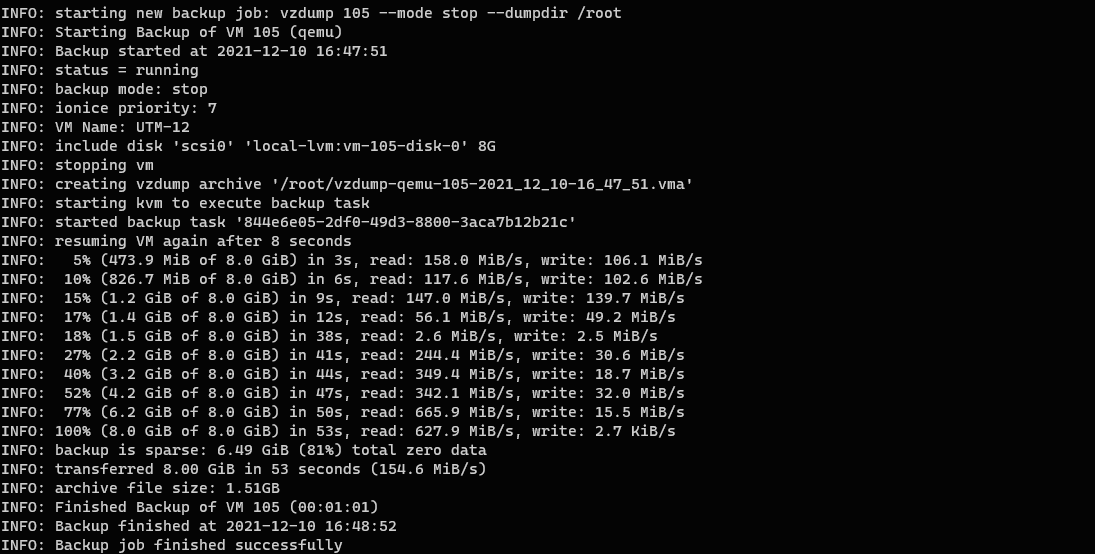 В результате в целевой директории появится файл образа с именем подобным vzdump-qemu-105-2021_12_10-16_47_51.vma, которое содержит тип виртуальной машины - qemu/lxc, ее ID, а также дату и время создания. Расширение .vma соответствует несжатому образу, при использовании компрессии добавится еще одно расширение архиватора, для Zstandard - .vma.zstd. Также рядом появится файл с расширением .log, в нем находится показанное на скриншоте выше содержимое и для восстановления он не нужен. Хотя, если вы собираетесь хранить данный образ, то мы советуем копировать его вместе с файлом лога, в последующем это позволит проще и быстрее разобраться с назначением данного дампа.