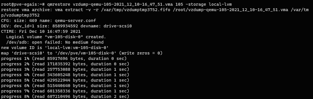 1qmrestore /root/vzdump-qemu-105-2021_12_10-16_47_51.vma 105 -storage local-lvm
