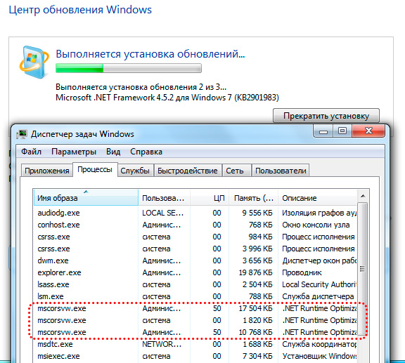Когда это происходит? Прежде всего после установки данной платформы, но это довольно редкий сценарий, тем более что .NET Framework уже входит в состав современных версий Windows. Однако обновления для .NET Framework выпускаются достаточно регулярно, что заставляет mscorsvw.exe выполнять перекомпиляцию библиотек платформы.