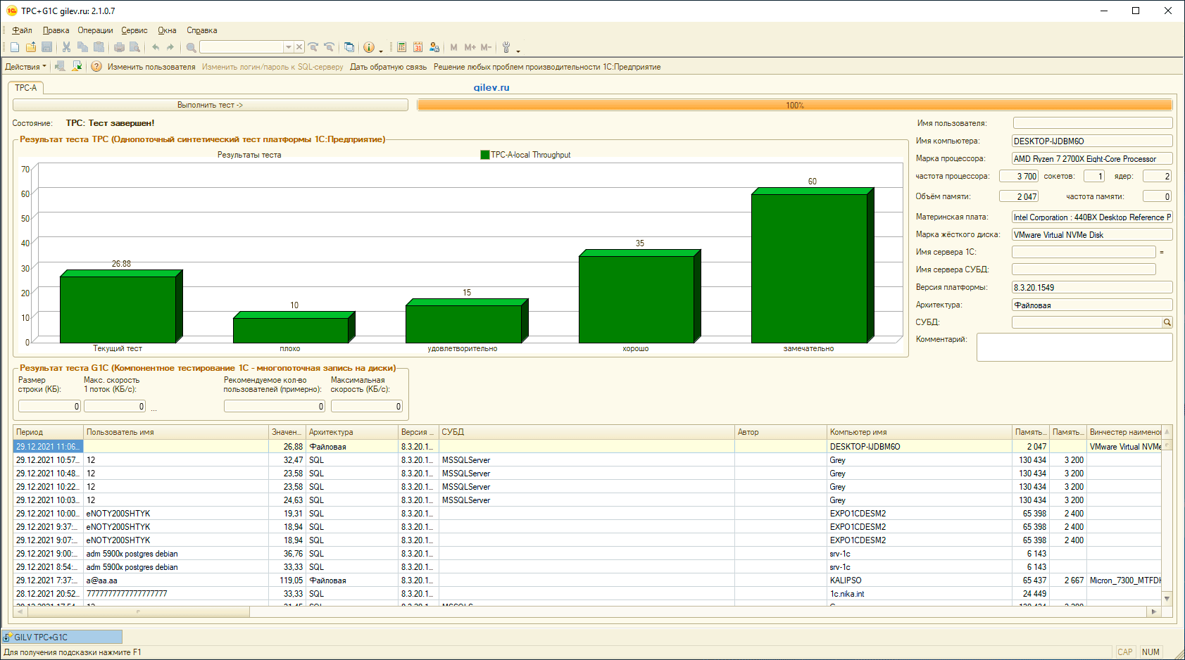Имеется вполне средняя виртуальная машина с Windows 10 (2 виртуальных ядра и 2 ГБ памяти) и платформа 8.3.20.1549, а также Тест Гилева, который служит де-факто эталоном тестирования производительности платформы. Операционная система в состоянии "из коробки", ничего не отключено, никаких оптимизаций не производилось. Вполне типичная ситуация для многих случаев: вот ПК, вот 1С, быстренько ставим одно на второе и рабочее место готово.