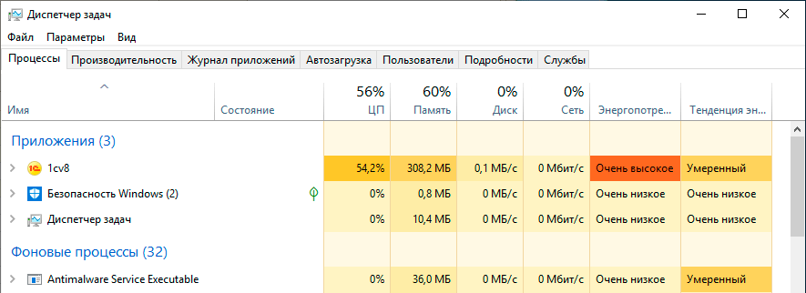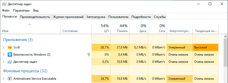 Достаточно интересно наблюдать загрузку процессора при включенном антивирусе, тест у нас однопоточный, а следовательно, при двухъядерной системе полной загрузке одного ядра будет соответствовать 50%, в нашем случае они равномерно делятся между 1С и Защитником.