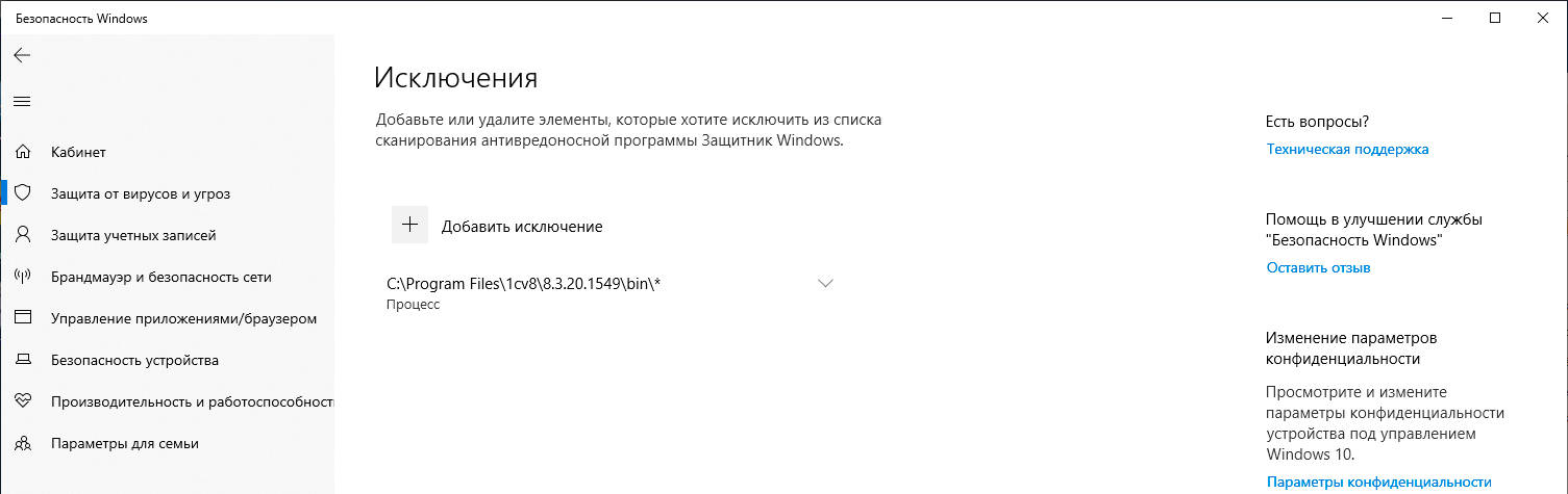 Что делать? Microsoft Defender позволяет устанавливать исключения для процессов, причем достаточно гибко, с использованием путей и подстановочных символов. Сначала просто попробуем исключить процессы самого 1С:Предприятия вне зависимости от пути установки (платформ может быть и несколько) по маске 1cv.exe*.
