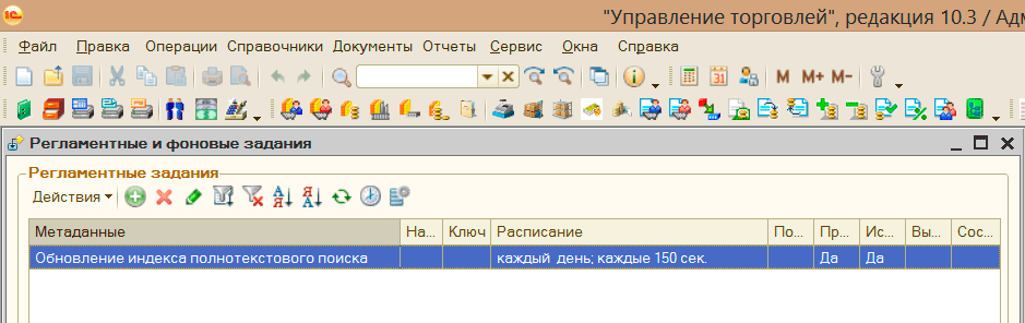 А вот и "виновник торжества" - задание обновления индекса полнотекстового поиска, которое запускалось один раз в 2,5 минуты. В данном случае проблема была полностью решена отключением выполнения регламентных заданий под этим пользователем, однако это не всегда возможно или целесообразно, поэтому ниже мы рассмотрим каким образом можно управлять регламентными заданиями и как сделать так, чтобы они не оказывали негативного влияния на производительность.