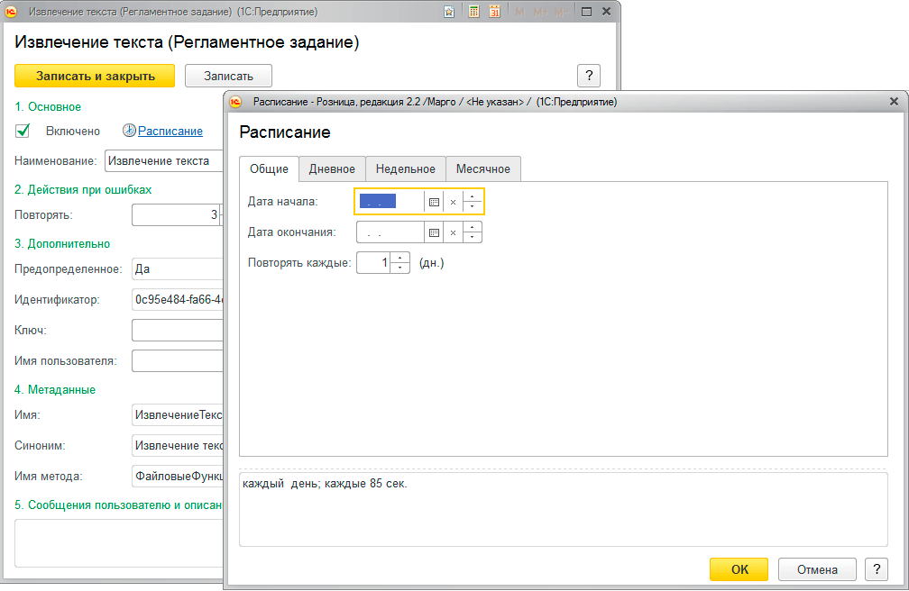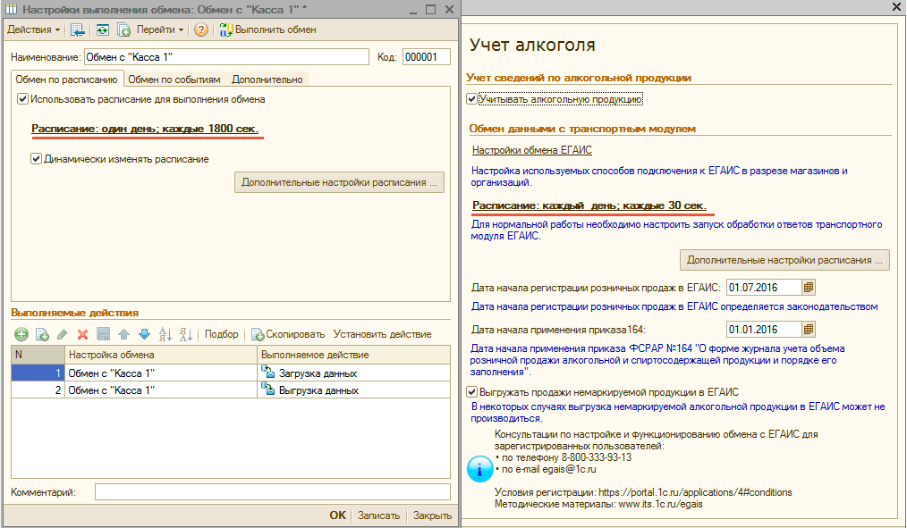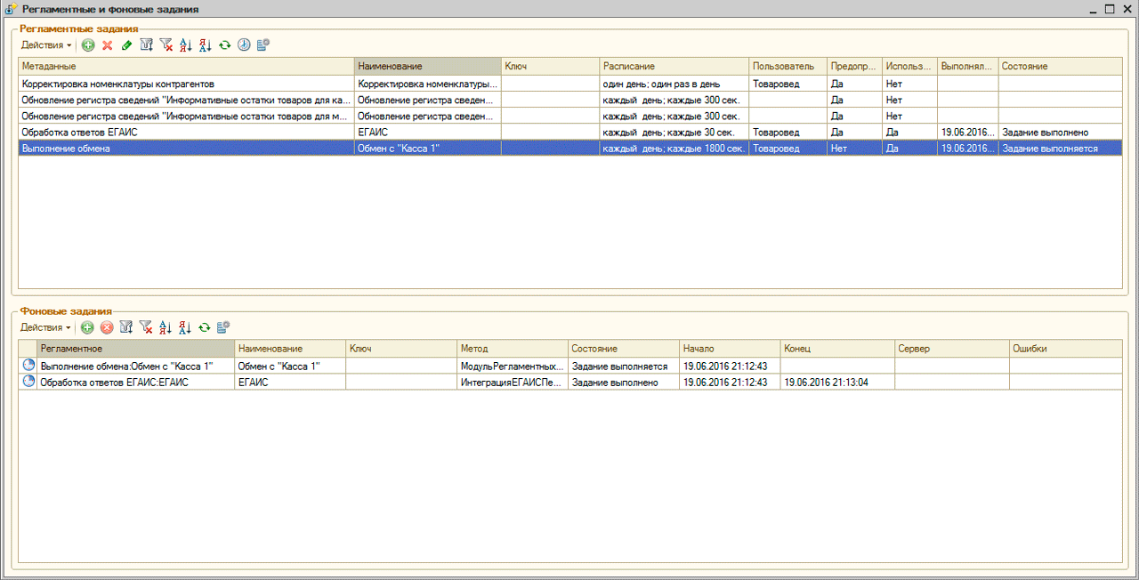 Данный список нужно тщательно изучить, все ненужные задания следует отключить, а у нужных привести расписание в соответствие с насущными потребностями и здравым смыслом. Например, в нашем случае, нет никакой необходимости обрабатывать ответы ЕГАИС раз в 30 секунд (эта настройка сделана для тестирования) и в рабочем режиме вполне достаточно будет делать это скажем раз в полчаса.