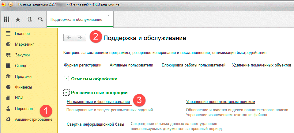 Для управления регламентными заданиями предназначен отельный пункт в меню Администрирование - Поддержка и обслуживание.