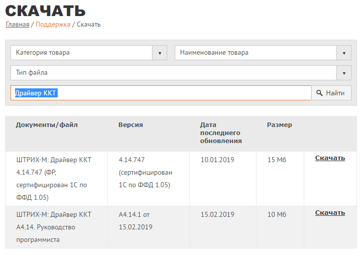 Будем считать, что у вас на руках касса ШТРИХ с последней прошивкой, а также актуальная конфигурация 1С. Свежий драйвер ШТРИХ-М всегда можно скачать с сайта производителя. Если же вы перешли не по нашей ссылке, то просто выполните в разделе Скачать поиск по фразе "Драйвер ККТ", в противном случае его поиск может превратиться в "увлекательный" квест.