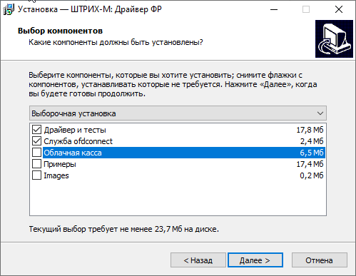При установке драйвера обязательно выберите два компонента: Драйверы и тесты и Служба ofdconnect.