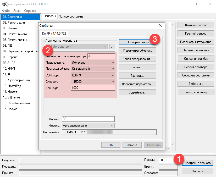Перейдем в Тест драйвера ФР - Настройка свойств. В открывшемся окне заполним параметры подключения: Локально с указанием используемого COM-порта и скорости. Затем нажмите Проверка связи и внизу вы должны увидеть наименование ККТ и ее серийный номер.