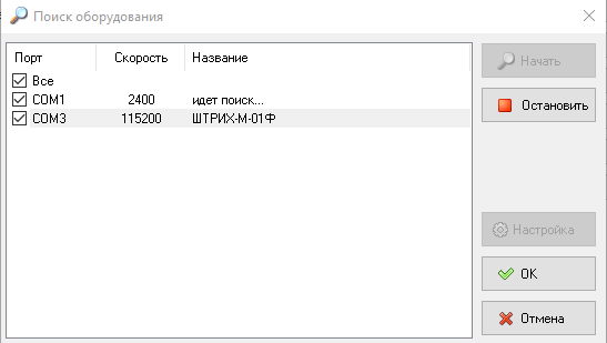 Если подключиться не удается или вы сомневаетесь в правильности указания обмена, то нажмите Поиск оборудования, утилита определит нужные параметры автоматически: