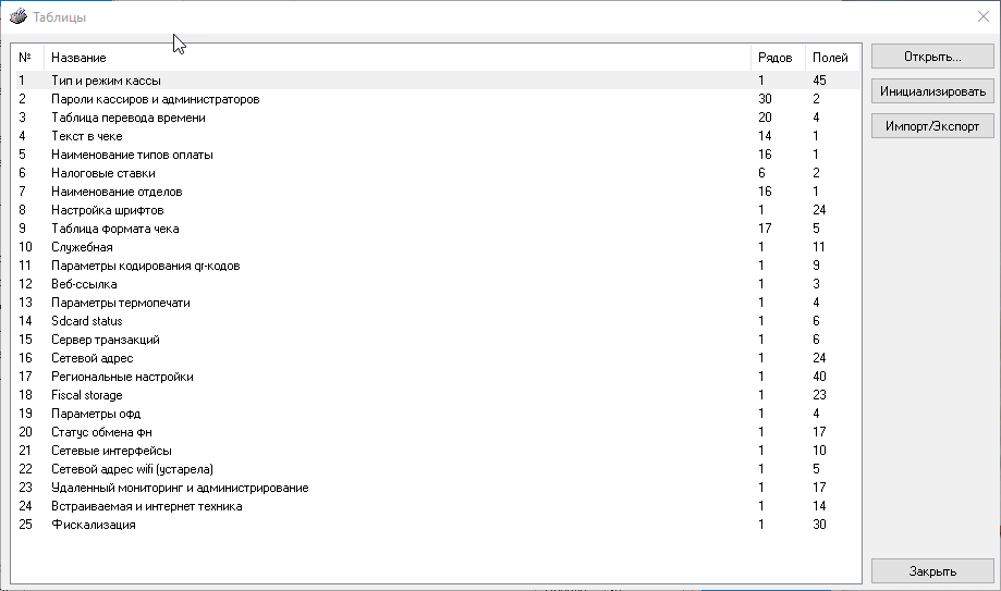 Обратите внимание, что структура таблиц общая для всех моделей ККТ, поэтому часть опций могут быть неприменимы к вашей модели. Скажем, если в ней нет отрезчика, то настраивать его опции бесполезно, несмотря на то что они есть.