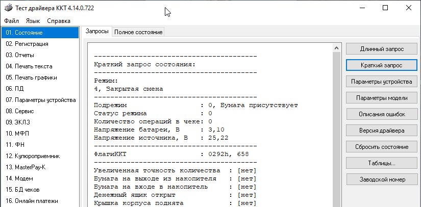 Ненадолго вернемся в сам Тест драйвера. Пункт 01. Состояние позволяет получить разнообразную информацию о кассе: статус смены, наличие бумаги, состояние датчиков и т.д. и т.п.