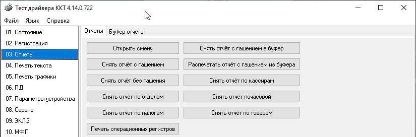 В разделе 03. Отчеты можно выполнить открытие / закрытие смены, снять отчет без гашения.