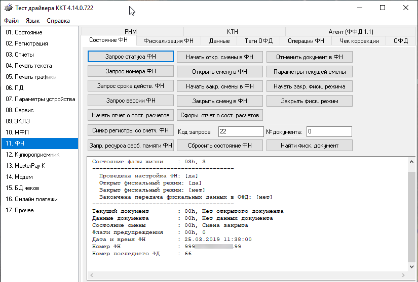 Для работы с фискальным накопителем перейдите в 11. ФН, однако здесь нужно быть предельно осторожным, так как вам будут доступны потенциально деструктивные операции с накопителем.