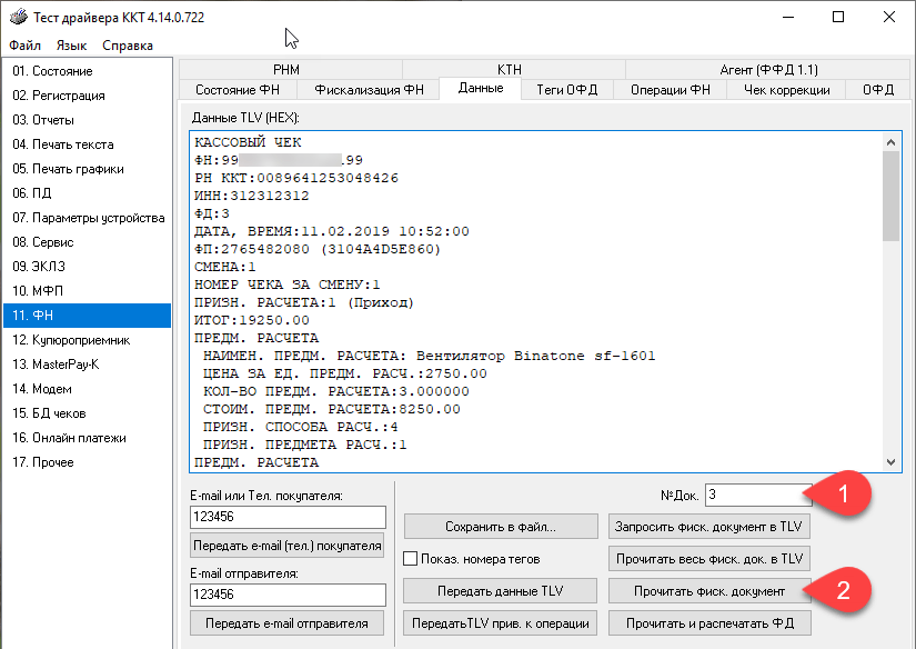 Закладка Данные позволяет получать информацию из фискального накопителя, например, мы можем получить содержимое документа (чека) по номеру и распечатать копию при необходимости.