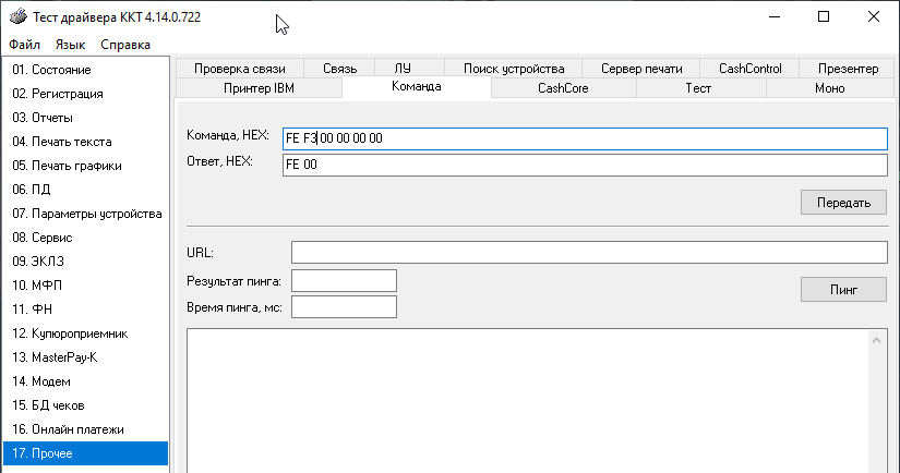 Отдельного разговора заслуживает раздел 17. Прочее - Команда, который позволяет отправлять на кассу низкоуровневые команды. Очевидно, что использовать эту возможность надо осмотрительно, но в ряде случаев она способна сильно облегчить жизнь. Например, для удаленной перезагрузки ККТ ШТРИХ следует послать команду: