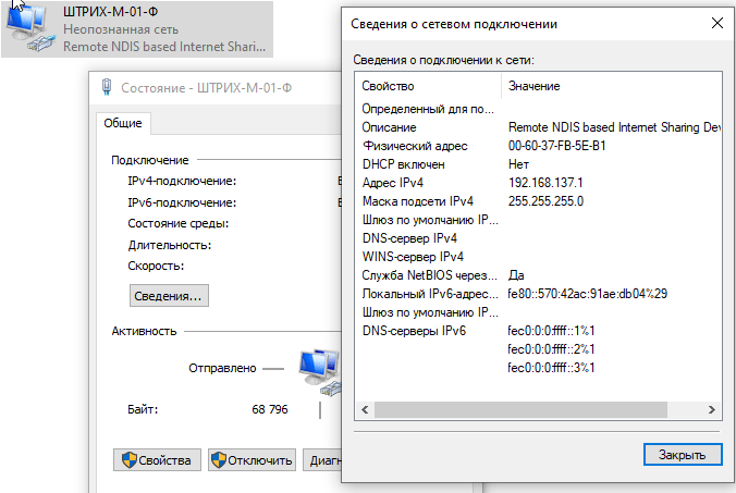 После чего порт VCOM пропадет, но появится новый сетевой адаптер с типом Remote NDIS based Internet Sharing Device, по умолчанию ККТ имеет адрес 192.168.137.111, поэтому присваиваем адаптеру любой иной адрес из этой подсети, в нашем случае 192.168.137.1.