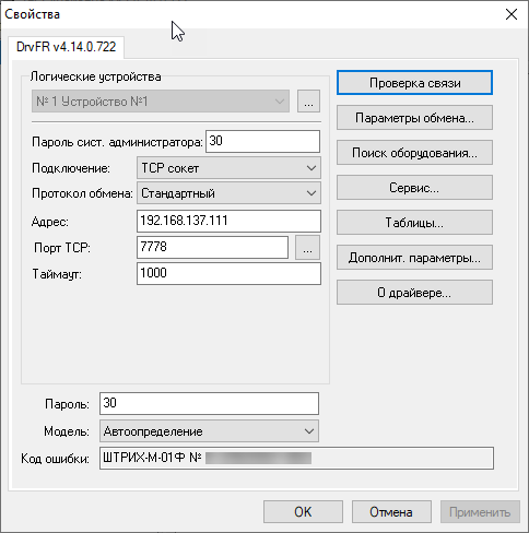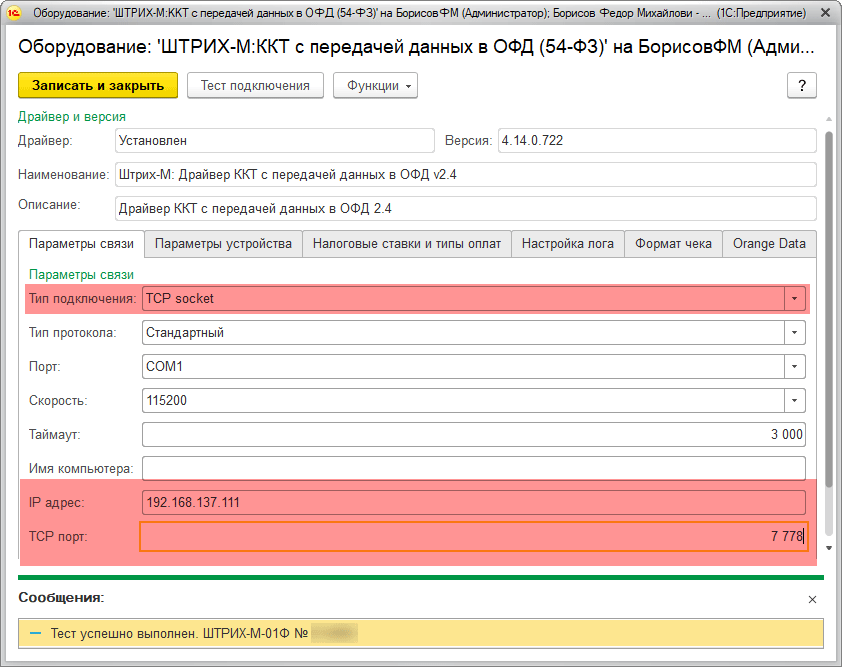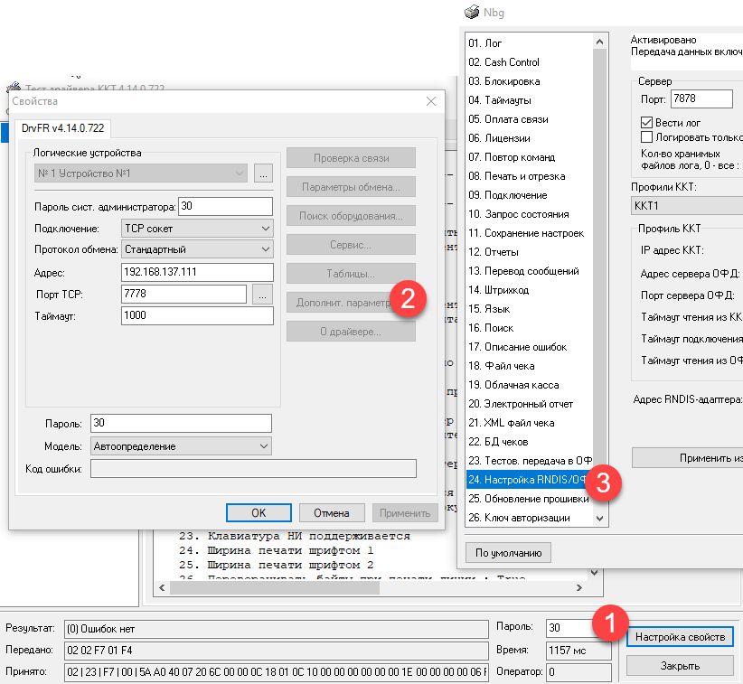 Снова откроем Тест драйвера и укажем следующие параметры подключения: TCP-сокет, Адрес - 192.168.137.111, порт - 7778. Если все сделано правильно - связь с ККТ будет.