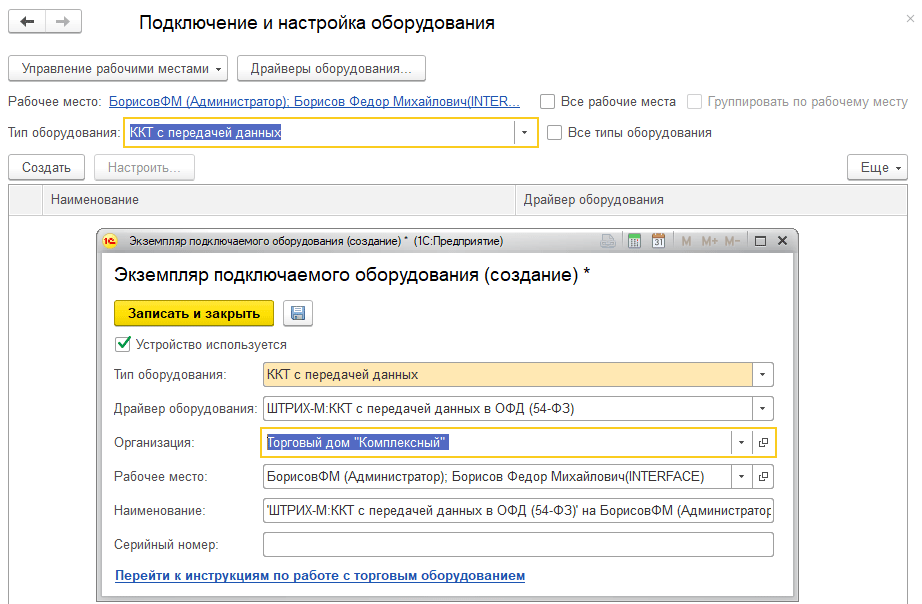 Необходимый для работы ККТ ШТРИХ драйвер торгового оборудования поставляется в составе конфигурации и никаких дополнительных действий выполнять не надо. Создаем новый экземпляр оборудования, тип оборудования - ККТ с передачей данных, драйвер оборудования - ШТРИХ-М:ККТ с передачей данных в ОФД.