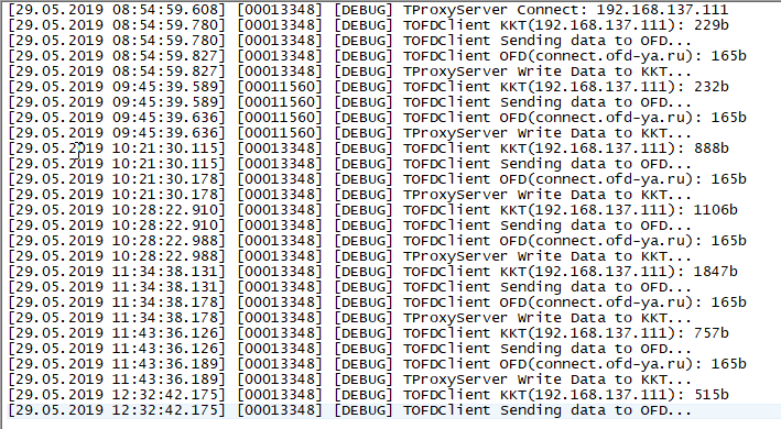 Проконтролировать обмен с ОФД можно в логах, которые находятся здесь же в отдельной папке. Логи ведутся в текстовом формате и отображают процесс получения службой данных от ККТ, передачу их в ОФД, получение и запись в ККТ ответа от оператора.