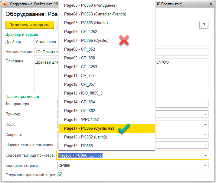 Особое внимание обратите на кодовую таблицу принтера, в списке присутствует две кодовых таблицы кириллицы Page07 и Page17, в случае с Posiflex Aura-6900 нужно выбрать вторую - Page17, кодировка строки должна быть CP866.