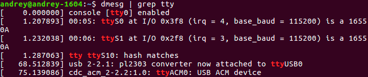 Для того, чтобы вы могли осознанно разобрать ее вывод, сделаем небольшое отступление. В Linux последовательные порты являются стандартными терминалами ввода-вывода, что позволяет очень просто работать с ними используя потоки. Для обозначения терминалов используется обозначение tty, физические последовательные порты обозначаются как ttySn, где n - номер порта начиная с нуля. Виртуальные COM-порты, в зависимости от реализации, обозначаются как ttyACMn и ttyUSBn.