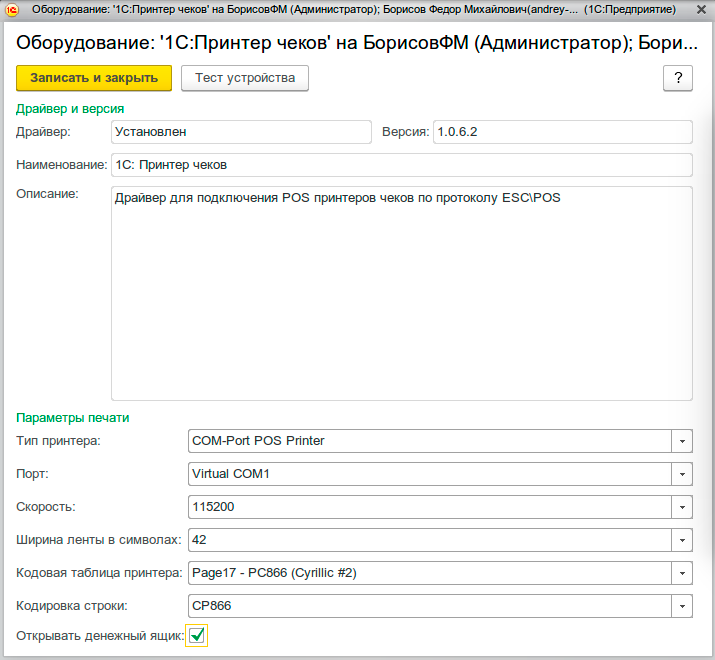 Драйвер от 1С поддерживает два типа подключения: Windows POS Printer и COM-Port POS Printer. Первый тип предназначен для работы с принтерами чеков установленными в системе как обычный Windows-принтер, это дает возможность печатать на принтере, не имеющем COM-порта (USB, LAN, Wi-Fi и т.д.), в настройках вы должны выбрать установленный в системе принтер, указать ширину ленты, кодовую таблицу и кодировку строки. Поля Порт и Скорость для данного типа подключения игнорируются.