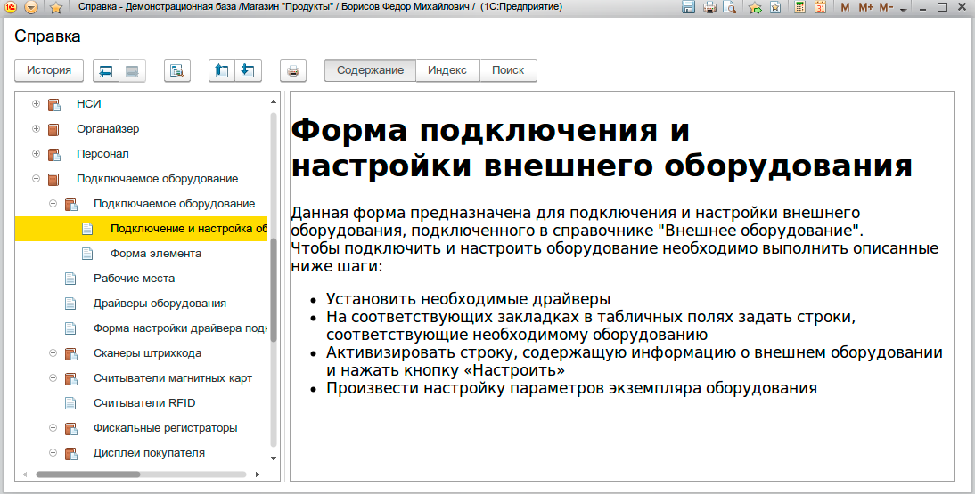 Встроенная справка предельно лаконична и вряд ли сможет реально помочь с подключением оборудования. Поэтому мы еще раз выразим свою убежденность, что хороший профессионал должен знать не только свою узкую область (в данном случае 1С), но и основы администрирования системы, в которой ему приходится работать. В противном случае даже простые вопросы могут вызвать нешуточные сложности.