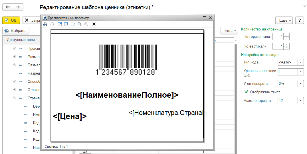 Точно также переходим в Администрирование - Печатные формы, отчеты и обработки - Шаблоны этикеток, ценников и чеков ККМ, но выбираем Этикетка (ценник) для товара. После чего откроется похожий конструктор, но готовых шаблонов под размеры этикеток в нем нет, все придется настраивать самостоятельно. Процесс не сказать, чтобы сложный, но простой пользователь с ним явно не справится, поэтому все шаблоны придется готовить техническим специалистам.