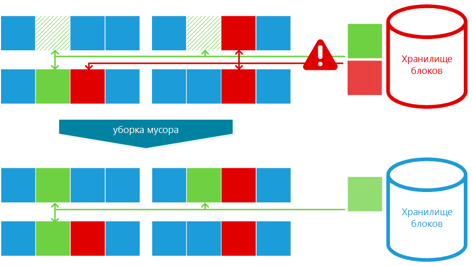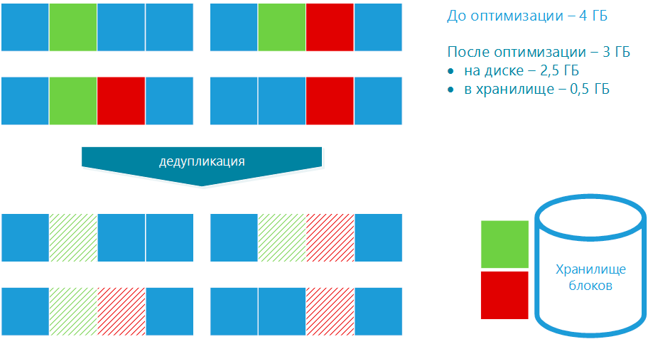 Уникальные данные обозначены синим цветом, а одинаковые блоки зеленым и красным. В процессе дедупликации такие блоки копируются в специальное хранилище и в таблице файлов (MFT) ссылки на них заменяются ссылками на блок хранилища. Оптимизированные блоки могут быть сразу очищены, безо всякого опасения потери данных, тем самым достигается выигрыш в дисковом пространстве.
